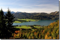 Wolfgangsee – наверно, самое живописное из озер Зальцкаммергута, окруженное горами со всех сторон. Длина озера – 11.5 км, а наибольшая глубина – 114 м. По краям озера расположились поселки Санкт-Гильген и Штробль, а в центре, разделенные 200-400 м полосой воды – Санкт-Вольфганг и Abersee. Летом в поселках на берегу озера не протолкнешься, особенно в Санкт-Вольфганге, в котором абсолютное большинство зданий – гестхаусы и небольшие гостиницы. Да и зимой сюда приезжает много туристов встретить Рождество и Новый год. А вот осенью в Санкт-Вольфганге очень мало людей и поселок буквально вымирает после 6 часов вечера. Однако это не мешает зайти в небольшой ресторанчик и насладится вкусным ужином, а потом пойти на набережную и долго сидеть обнявшись при свете луны с любимой.